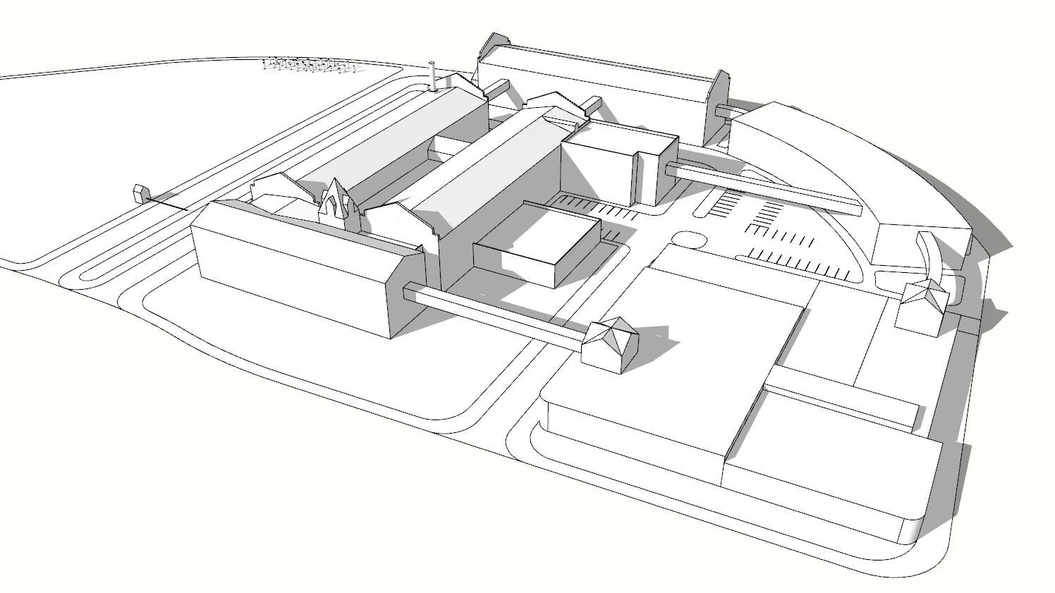 Dunwoody is looking to expand its campus and introduce student housing as well as more space for classrooms, and faculty offices. This is a masterplan which accomplishes both needs. All while keeping the general aesthetic of the existing Dunwoody campus. While also adding a more modern twist. It introduces skyways that connect every building, and introduces underground parking, freeing up half of the lot to be used as open green space to feel more like a traditional university campus.